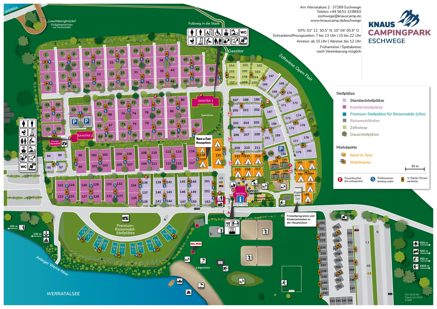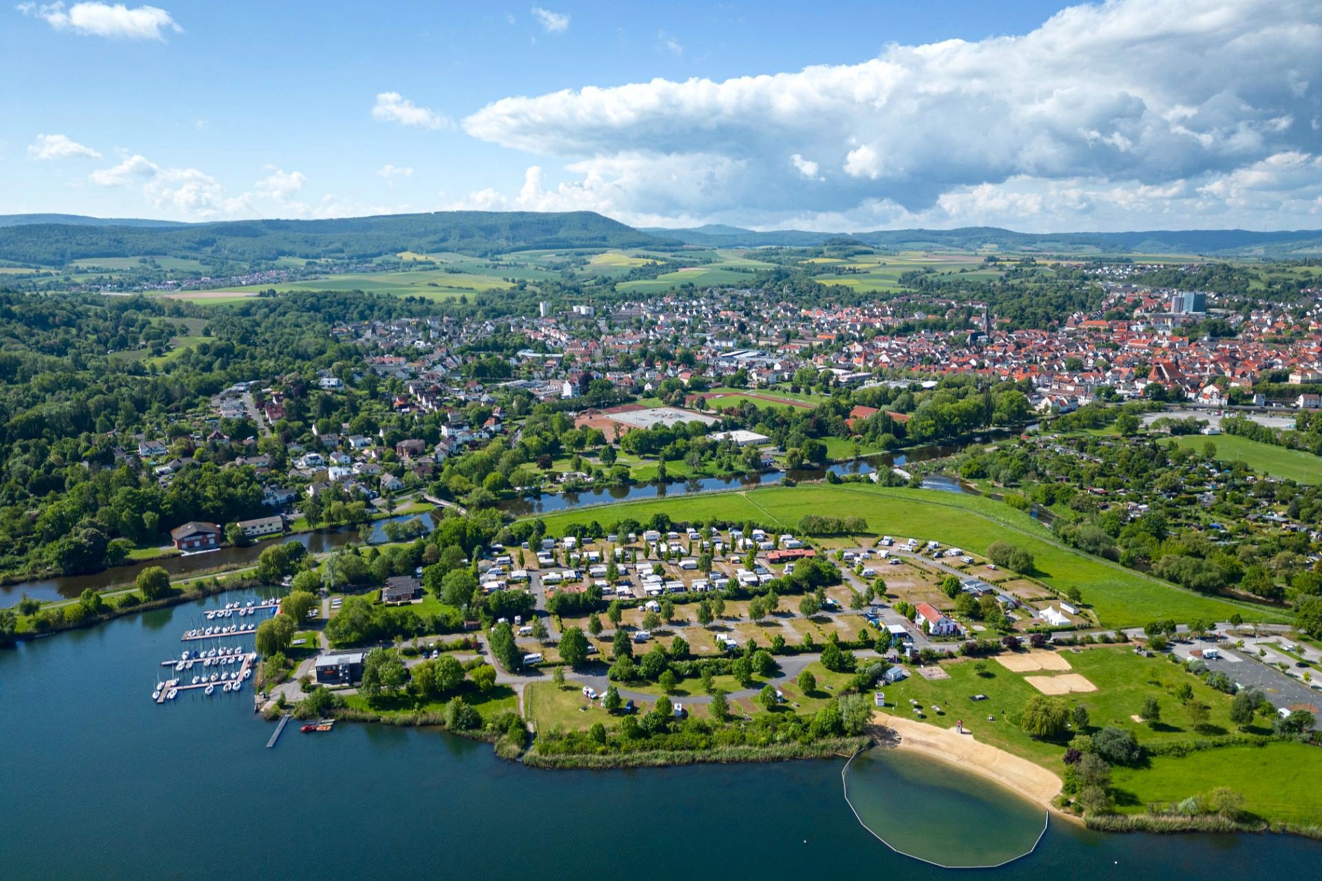 Auf einer Halbinsel, eingebettet zwischen dem Werratalsee und der Werra liegt der vom Hessischen Ministerium für Wirtschaft, Verkehr und Landesentwicklung mit dem 2. Platz preisgekrönte KNAUS Campingpark. Von allen Stellplätzen bietet sich unseren Gästen ein herrlicher Ausblick. Die Altstadt von Eschwege ist nur 5 Gehminuten entfernt. Der Knaus Campingpark bietet ein Bistro, Minimarkt, Beachvolleyballfeld und Kinderspielplatz. Komfortstellplätze, Mietbäder und Sanitäranlagen auf hervorragendem Niveau bieten gepflegte Entspannung mitten in Deutschland.