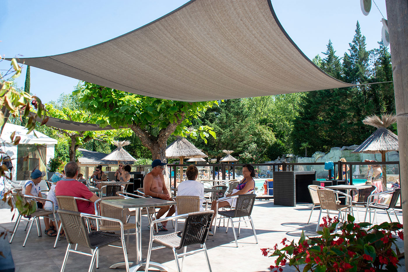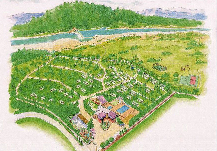 Zwischen den Stellplätzen und dem Fluss erstreckt sich ein großzügiges Gelände. Am Ufer der Ardèche finden Sie Sand-, Kies- und Grasflächen mit Liegestühlen und Picknicktischen. Eine kleine Wasserfallanlage und zahlreiche Bäume sorgen für eine angenehme Atmosphäre und schattige Plätze. Hier wird geschwommen, geangelt und am flach abfallenden Ufer gespielt.