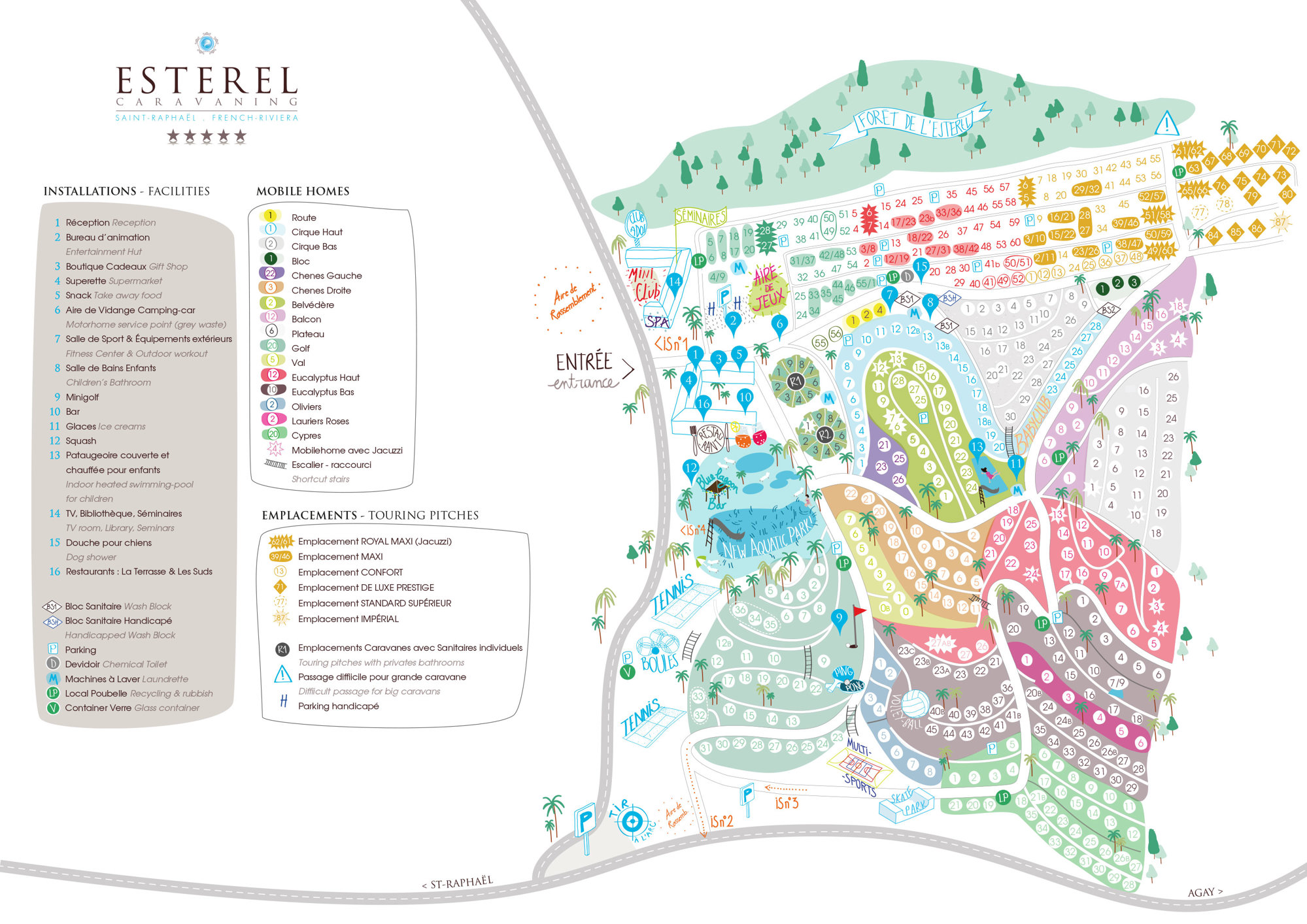 Der Campingpark Esterel Caravaning ist ein Spitzen-Campingplatz mit einer großen Poollandschaft sowie erstklassigen Service- und Freizeitangeboten. Mit Blick auf das rötlich leuchtende Esterel-Massiv und kurzen Wegen an die Côte d’Azur können Sie hier einen Traumurlaub genießen. Die Luxus-Mobilheime stehen auf parkartigen Parzellen in leicht ansteigender Terrassenlage. Durch die sorgfältig angelegten Wege erreichen Sie Ihr Urlaubsdomizil auch mit Kleinkindern. Von den sonnigen oder halbschattigen Stellplätzen aus genießen Sie einen herrlichen Weitblick über die Pinien- und Palmenhaine von Camping Caravaning Esterel.