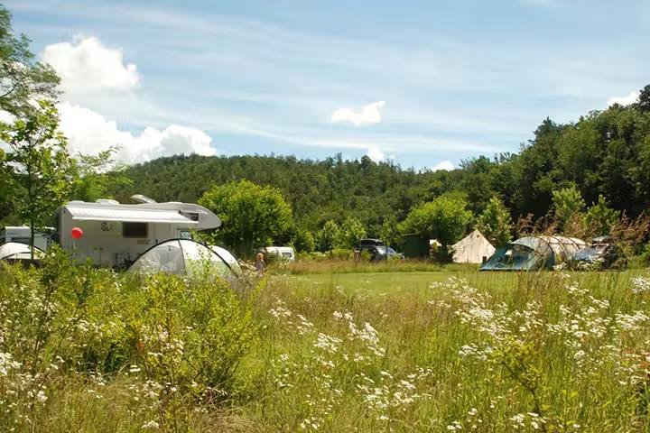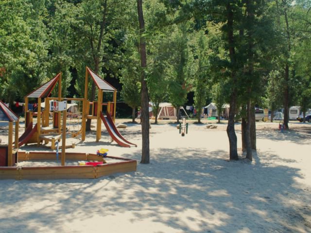Zwei Spielplätze (jeweils auf der unteren und oberen Ebene) sorgen für stundenlangen Spaß mit Klettergerüsten und Schaukeln. Zwischen Spielplatz und Teich gibt es zudem einen kleinen Sandstrand zum Buddeln. Bitte beachten Sie: Im Teich ist Baden verboten, dafür lädt der kleine Fluss, der um den Campingplatz fließt, zum Planschen und Abkühlen ein. Sportliche Gäste nutzen die Fußball- und Beachvolleyballfelder oder erkunden die hügelige Umgebung zu Fuß oder mit dem Rad.