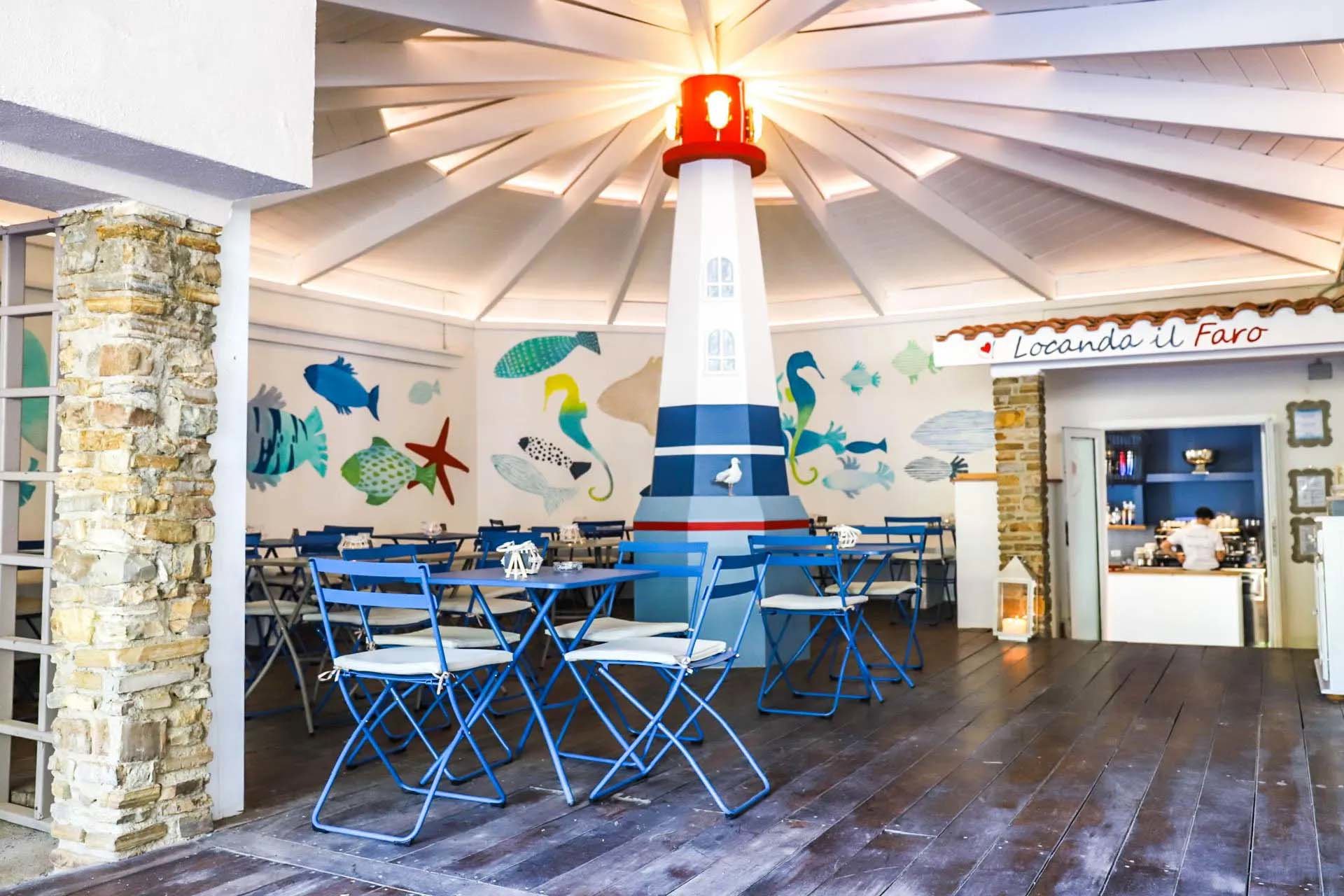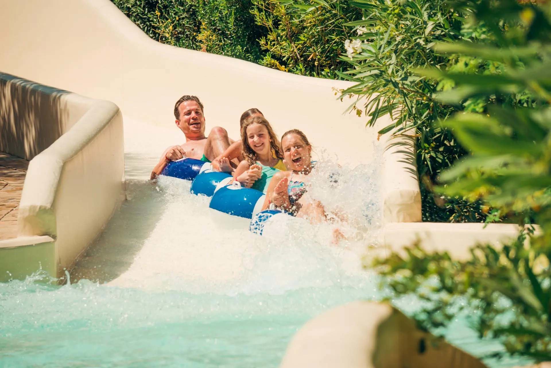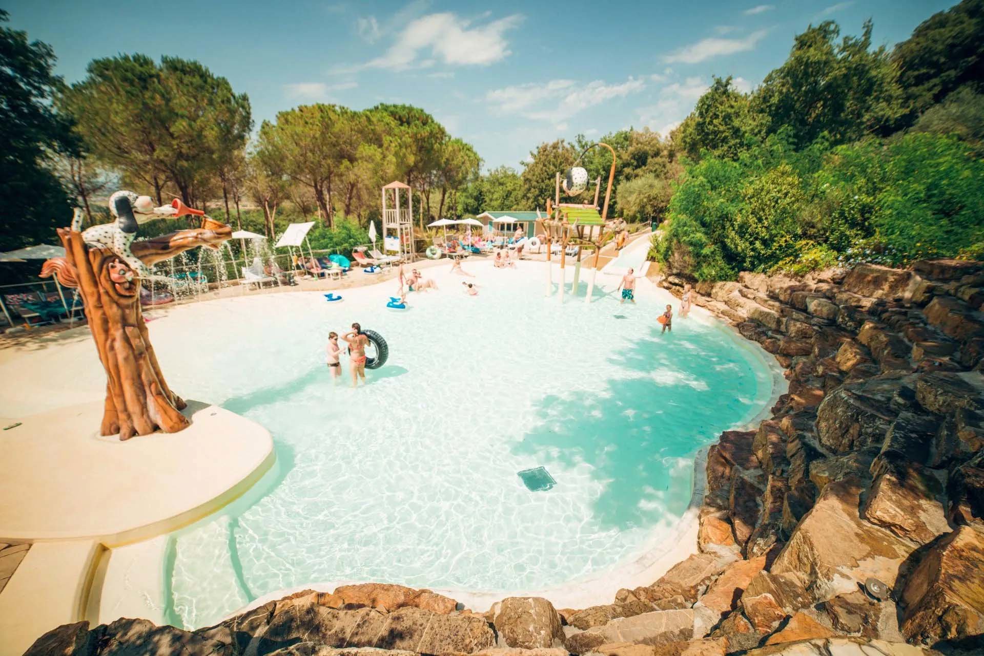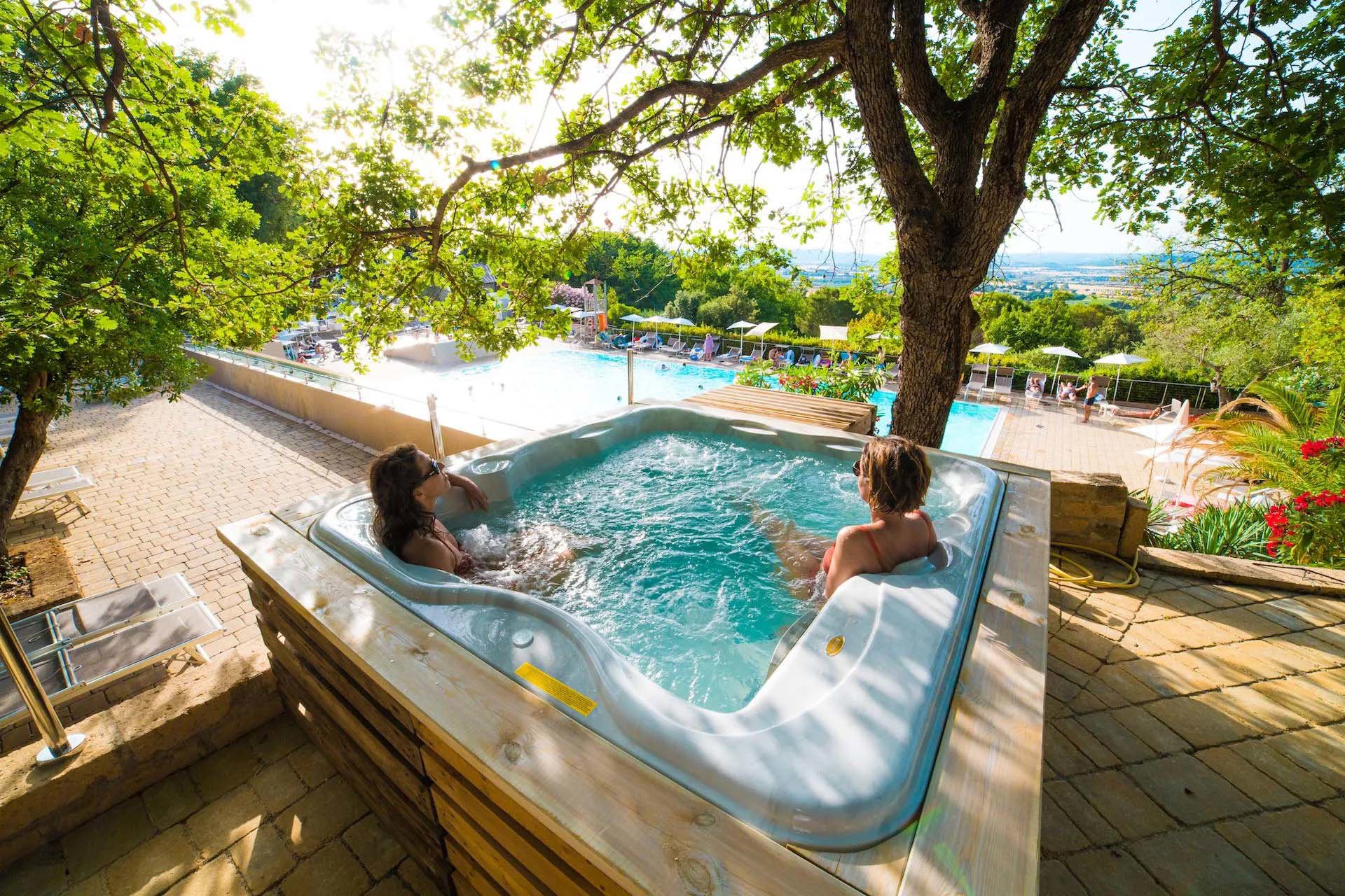 Zwischen den Olivenbäumen liegen die Terrassen und die hochwertigen Serviceeinrichtungen wie der Swimming Pool-Bereich mit Hydromassage, einem Lagunenbad und dem Kinderpool. Die Öffnungszeiten sind wetterabhängig, häufig hat das Schwimmbad 12 Stunden am Tag geöffnet. Ein Bademeister sorgt für Sicherheit.