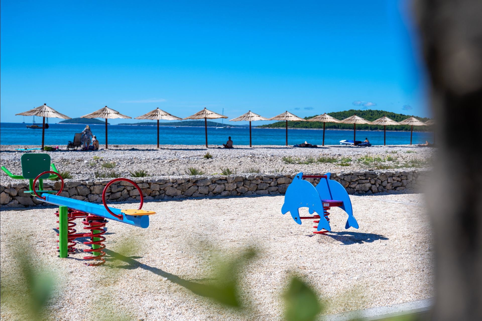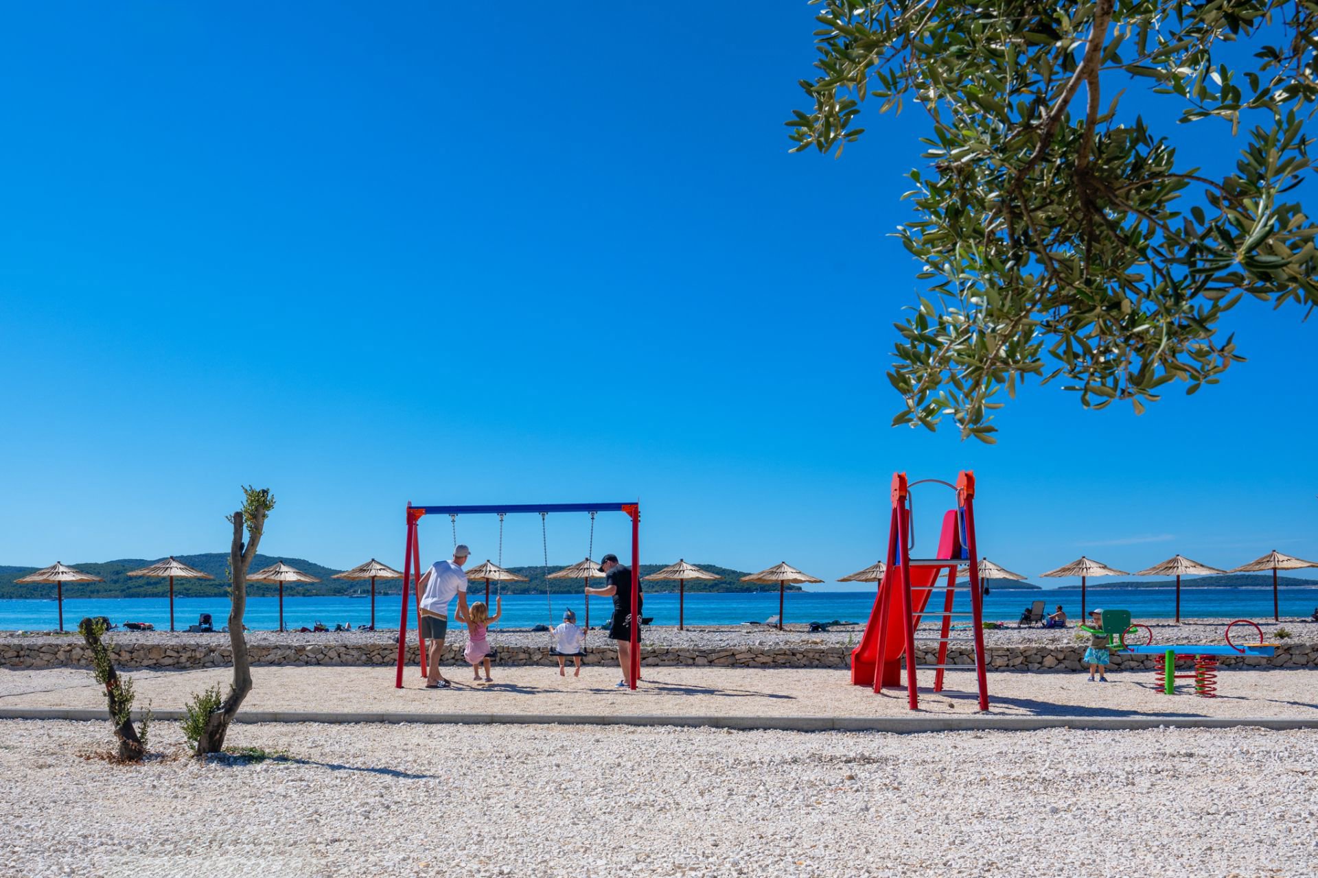 Von Ihrer Unterkunft aus gelangen Sie in wenigen Schritten zum Kiesstrand mit Liegestühlen und Sonnenschirmen. Für die jüngsten Gäste gibt es einen Spielplatz mit Schaukel, Rutsche und Wippe. Ein wunderbarer Ort an der traumhaften Küste Dalmatiens, an dem Sie vollkommen entspannen können. Auch Hunde sind herzlich willkommen (bitte bei der Buchung anmelden), denn der Campingplatz ist hundefreundlich gestaltet.