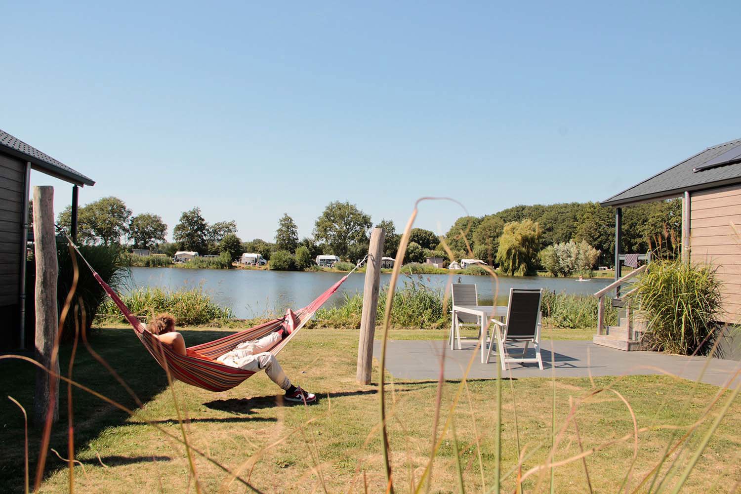 Die Sanitäranlagen von Camping Krieghuusbelten sind modern und sehr gepflegt. Wer keine eigene Ausrüstung mitbringen möchte, bucht einfach „Glamping“ in den Niederlanden: Camping Krieghuusbelten bietet mehrere Varianten von Mietunterkünften. Die sind fertig für die Gäste aufgestellt sowie stilvoll und umfassend eingerichtet. Ob Safarilodge mit Dusche und überdachter Veranda oder eine komplett eingerichtete Campinglodge mit Ofen – die Auswahl für Glamping-Ferien ist groß! Auch ein Tunnelzelt für 5 Personen kann vorreserviert werden. Es lohnt sich, rechtzeitig zu buchen, denn die Lodges auf diesem Campingplatz sind meist schnell ausgebucht.