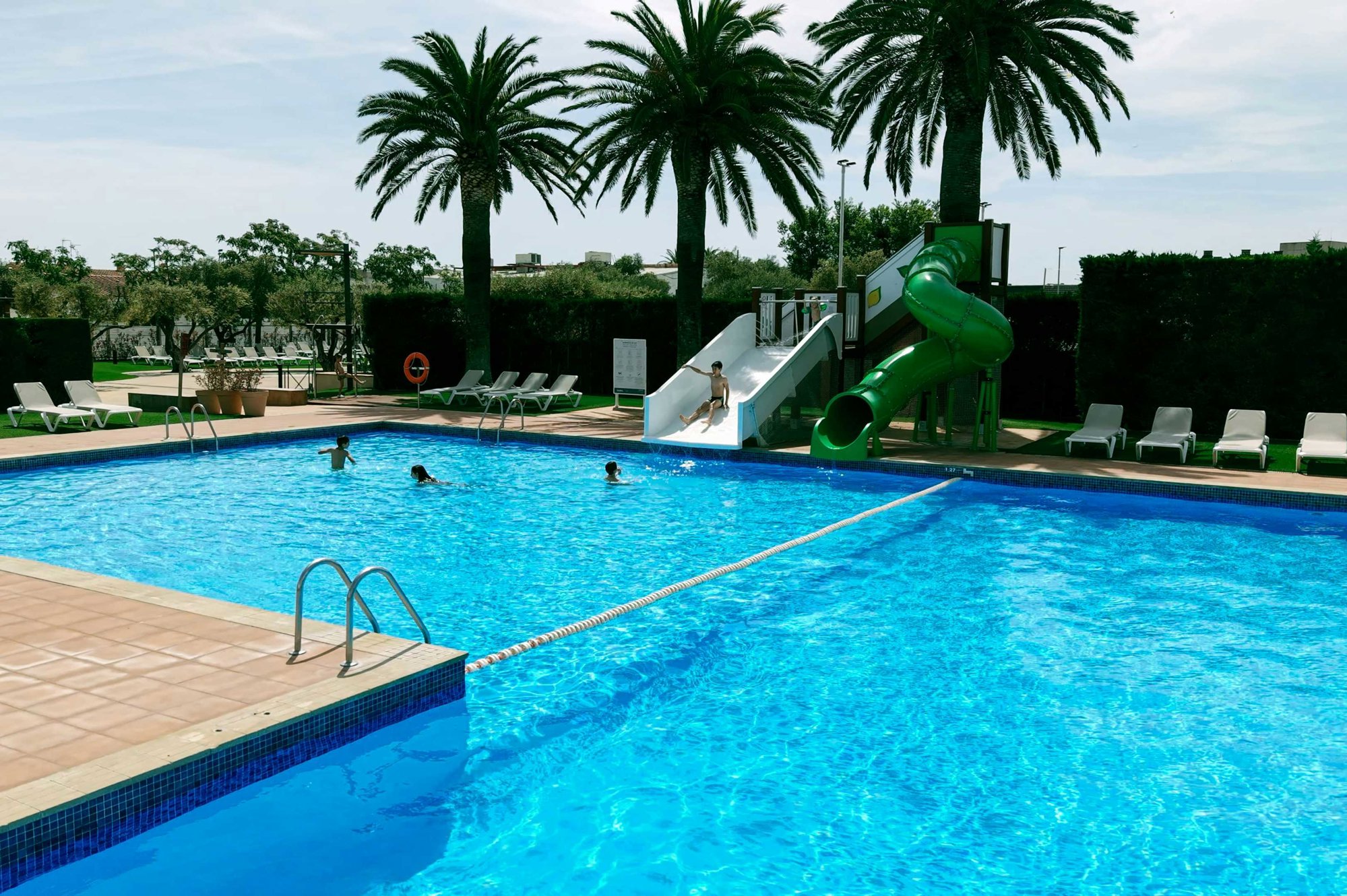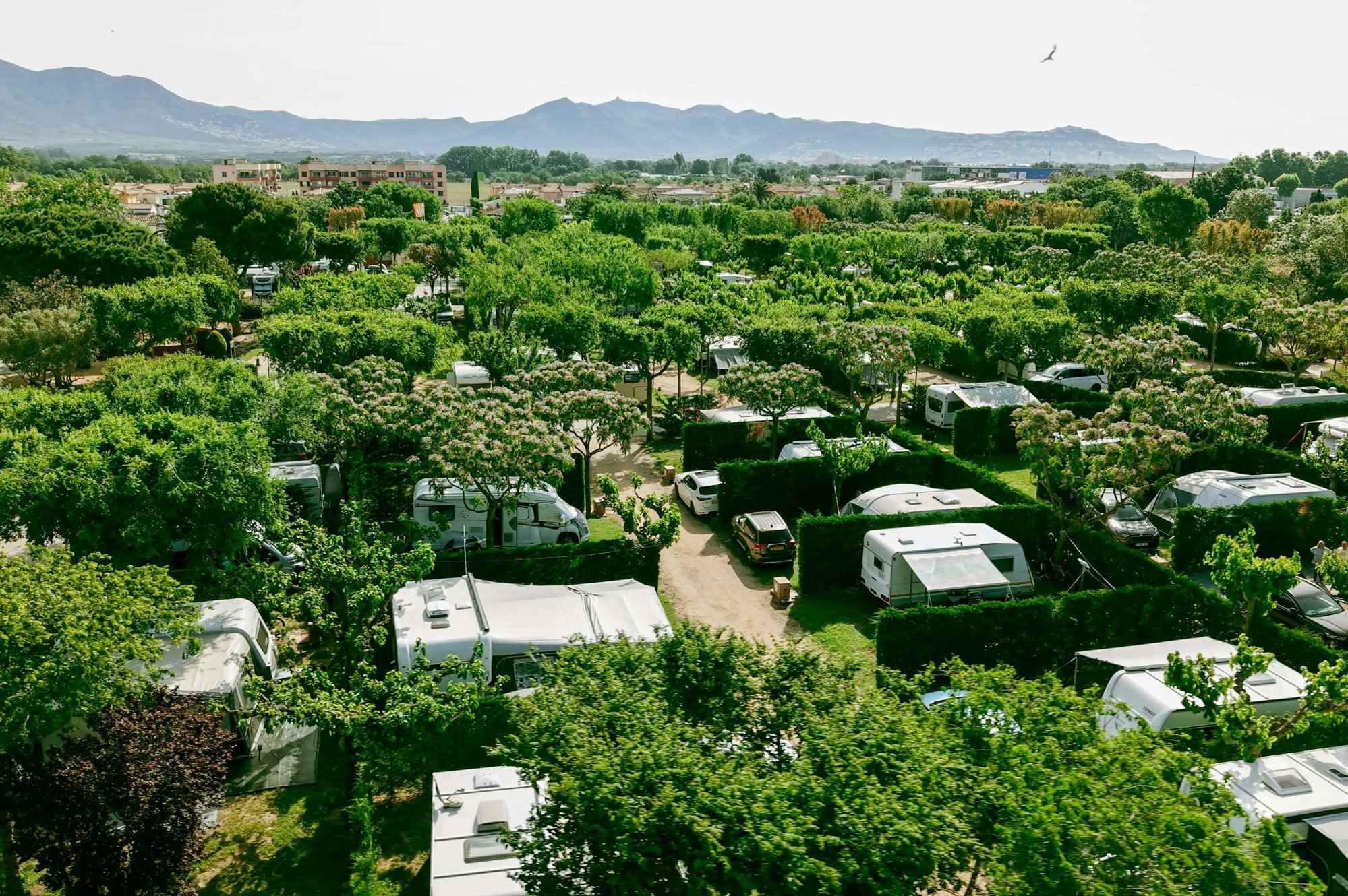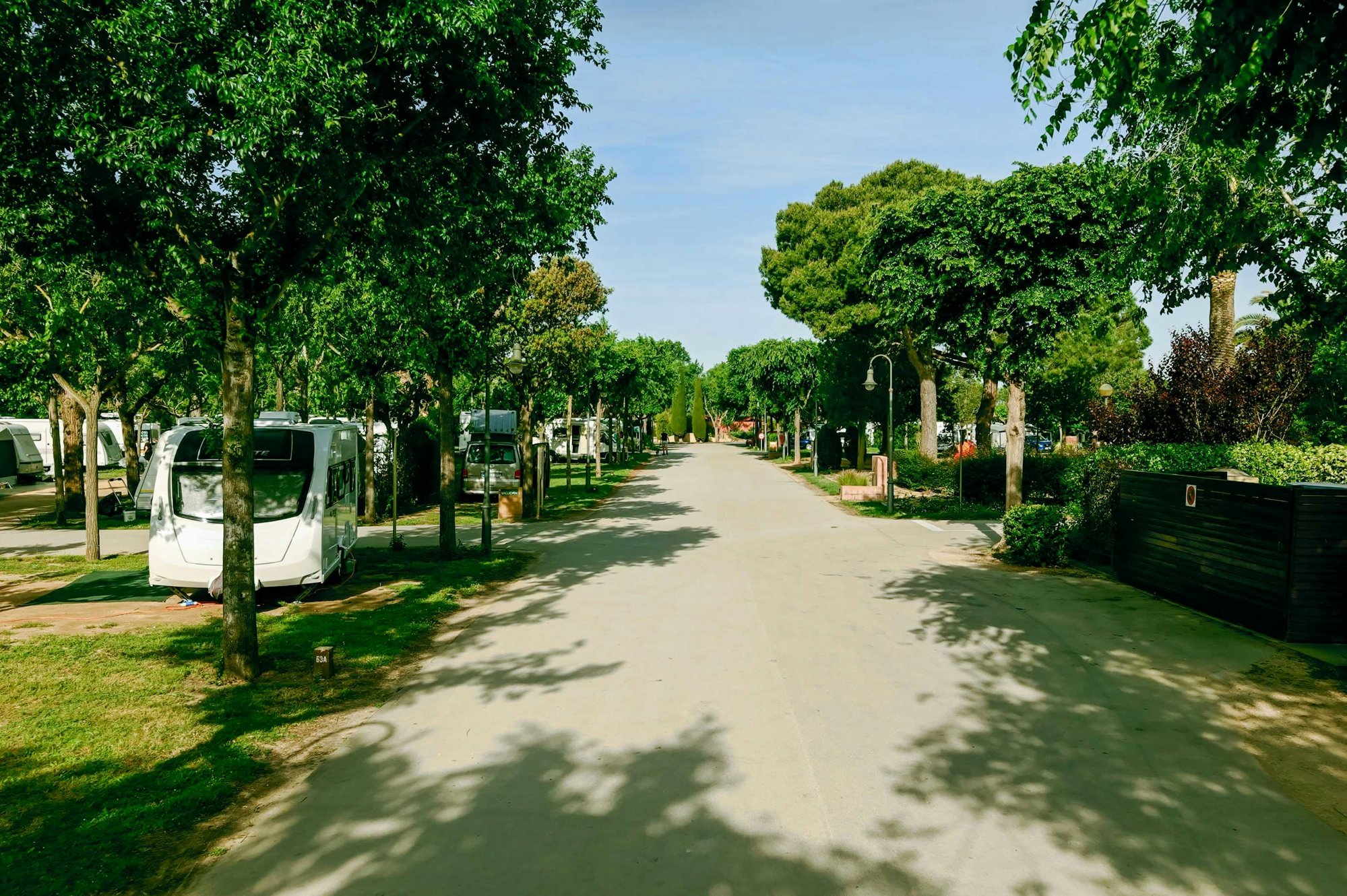 Auf dem blumigen, grünen Gelände befindet sich gleich rechts das Rezeptionsgebäude. Der Eingang setzt den Ton für den Rest des Platzes: alles ist ordentlich und gut gepflegt. Die Stellplätze sind größtenteils schattig. Gegenüber finden Sie ein schönes, geschmackvoll angelegtes Schwimmbad mit Liegen. Außerdem gibt es mehrere Sportfelder, auf denen Sie mit Freunden aktiv sein können. Der Supermarkt liegt um die Ecke – sehr praktisch. Auf dem Campingplatz gibt es einen Brötchenservice. Und natürlich darf auch ein Strandbesuch nicht fehlen: Der Weg zum Strand führt über den Hafenort Empuriabrava (das „Venedig Spaniens“).