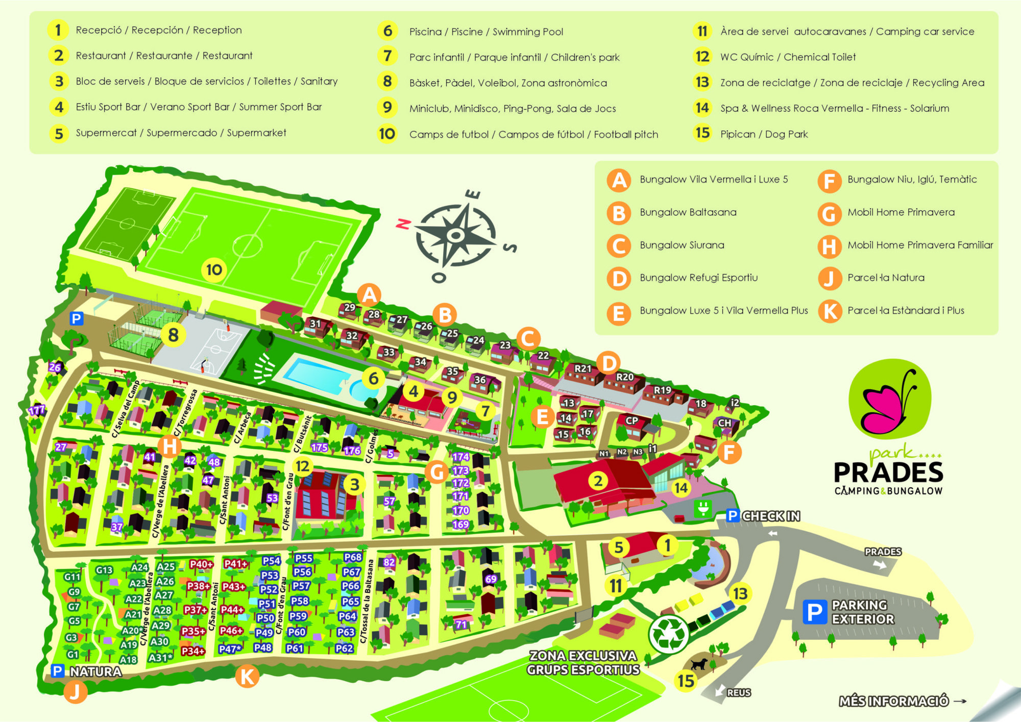 Zusätzlich gibt es auf dem Gelände eine Rezeption, ein Schwimmbad (20 x 10 m mit extra Kinderbecken, geöffnet vom 15. Juni bis 15. September), Bar, Restaurant, Supermarkt, Spielplatz, Fahrradverleih (1 Tag pro Aufentaltswoche kostenlos), Fußballplatz, Boule-Spiel und Tischtennistisch. Bei einem Aufenthalt von einer Woche erhalten Sie einen Tag ein kostenloses Mietfahrrad p. P. und bei 2 Wochen ein kostenloses katalanisches Mittag- oder Abendessen p. P. sowie Zugang inkl. Führung zum Kloster von Poblet.